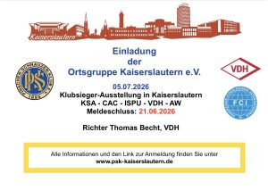 Für unsere KSA Ausstellung in der Ortsgruppe am 4.Juli 2026 wird bis Ende März online gestellt. Richten wird Thomas Becht, VDH.